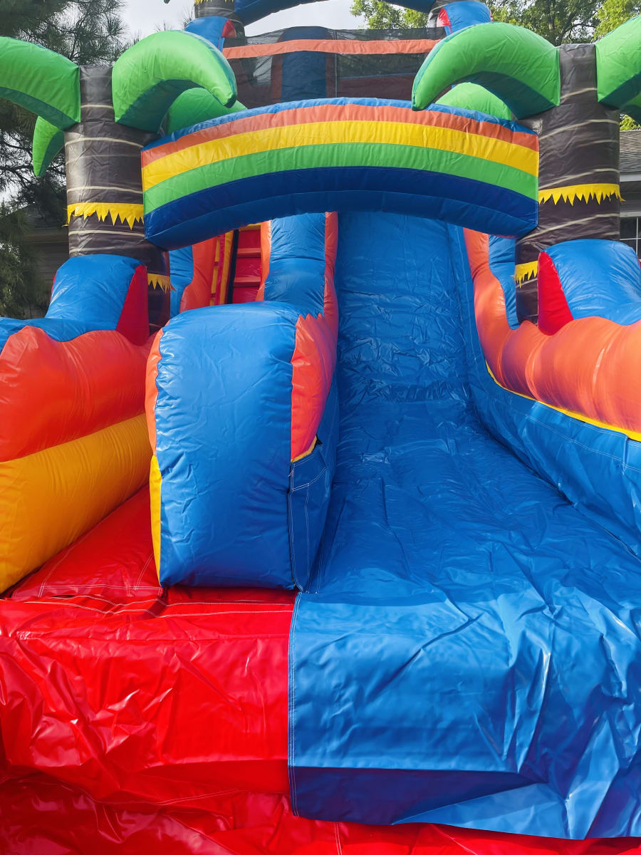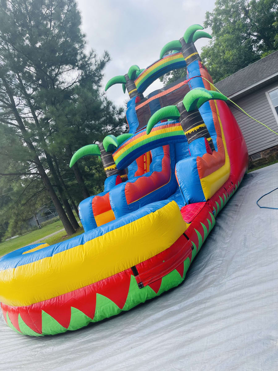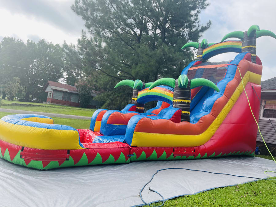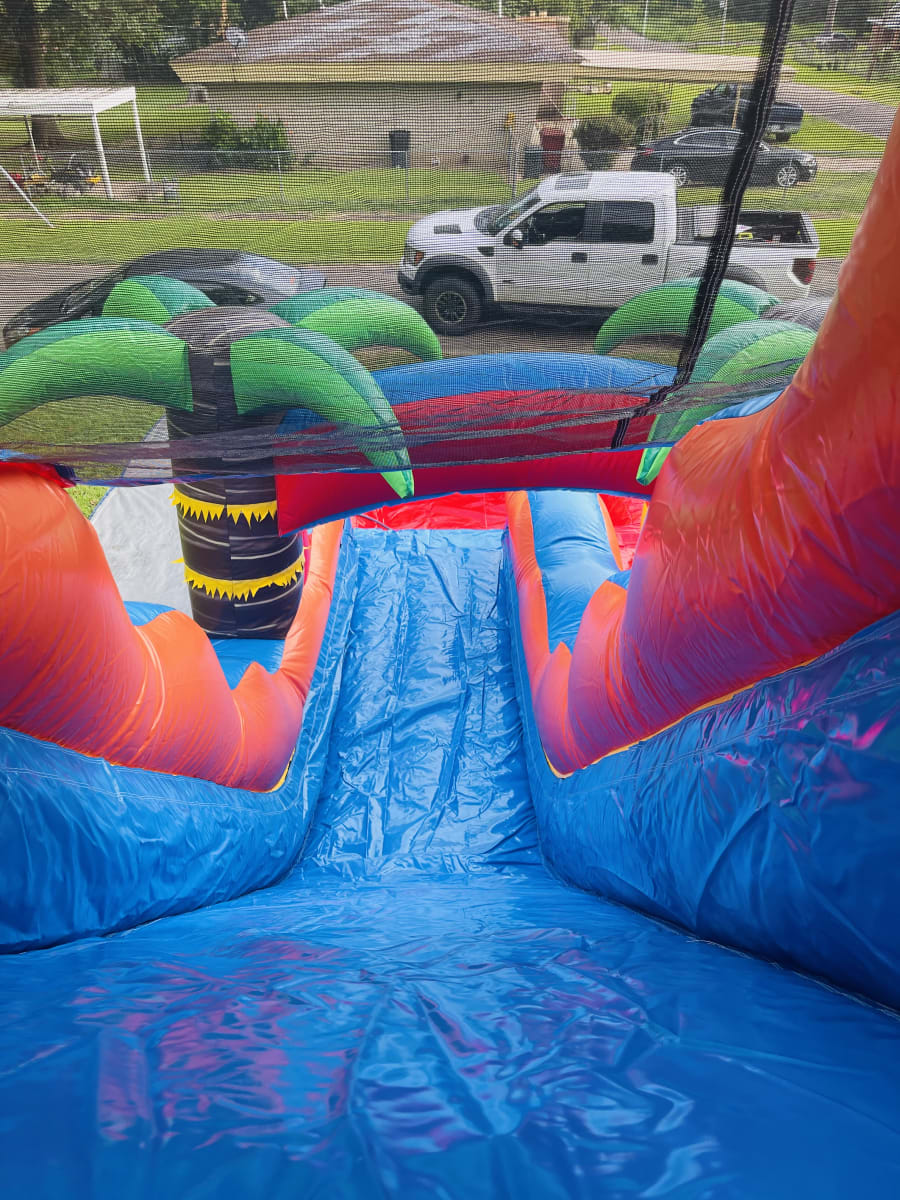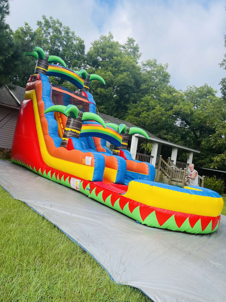 This is an 18ft single lane slide. It can be used wet or dry. This is a great slide for children and adults of all weights and sizes! This is a great water slide for those HOT 🥵 summer days! It boast a big refreshing pool at the bottom. The beautiful bright colors just scream summertime happiness and positive vibes! We are really excited about this new water slide 😀